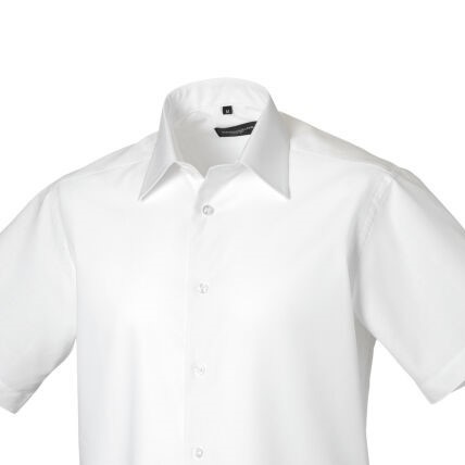 Russell Men’s Short Sleeve Oxford Shirt with non button down collar. 70% cotton; 30% polyester First part of content comes here
